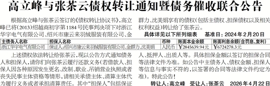 高立峰与张茶云债权转让通知暨债务催收联合公告