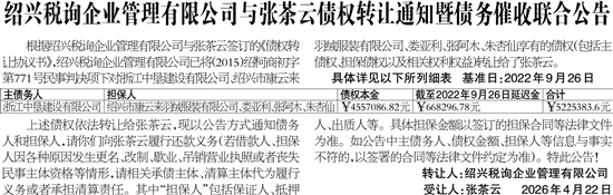 绍兴税询企业管理有限公司与张茶云债权转让通知暨债务催收联合公告