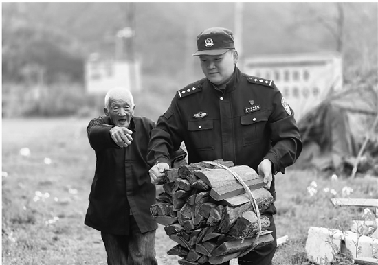 近日,三门公安横渡派出所副所长吴晓峰在下村走访时,遇见一位老人费力地独自搬运柴火。他二话不说接过柴火,一路护送老人回家。 通讯员 王璐莹 摄