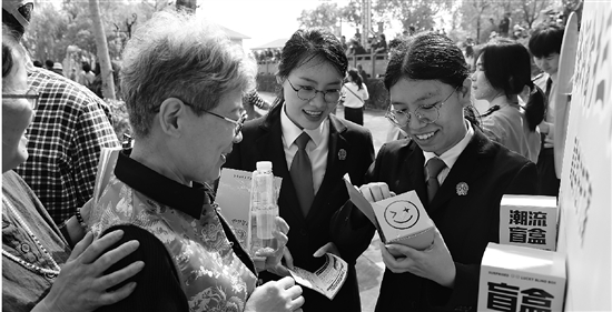 畲族“三月三”风情正浓。日前,兰溪市人民法院干警走进水亭畲族乡活动现场,创新推出“法治盲盒”趣味普法活动。一个个精心准备的盲盒里藏着法律知识问答、普法小礼品,吸引了众多畲乡群众和游客驻足参与。