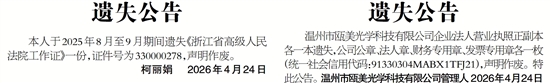 温州市瓯美光学科技有限公司企业法人营业执照正副本各一本遗失,公司公章、法人章、财务专用章、发票专用章各一枚(统一社会信用代码:91330304MABX1TFJ21),声明作废。特此公告。 温州市瓯美光学科技有限公司管理人 2026年4月24日