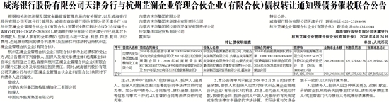 杭州芷澜企业管理合伙企业(有限合伙)作为上述债权的受让方,现公告要求下列借款人、担保人及相关承债主体(或清算主体)自本公告刊登之日起,直接向杭州芷澜企业管理合伙企业(有限合伙)履行还款义务及承担相应担保责任。同时,威海银行股份有限公司天津分行与杭州芷澜企业管理合伙企业(有限合伙)共同对下列债务人进行催收。