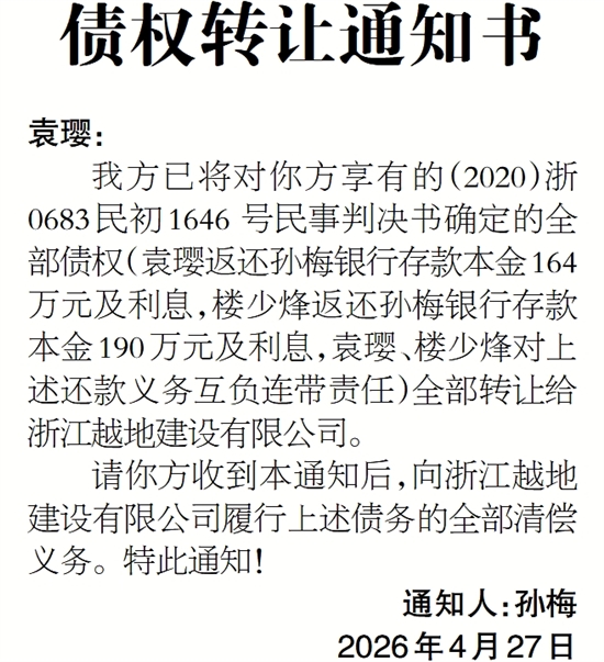 我方已将对你方享有的(2020)浙0683民初1646 号民事判决书确定的全部债权(袁璎返还孙梅银行存款本金164万元及利息,楼少烽返还孙梅银行存款本金190万元及利息,袁璎、楼少烽对上述还款义务互负连带责任)全部转让给浙江越地建设有限公司。