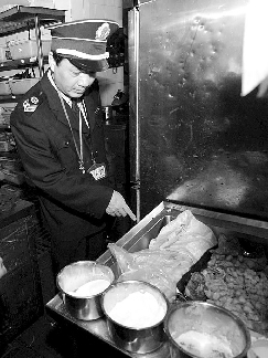 离开这家饭店后,执法人员又来到隔壁一家饭店的厨房。记者看到,这个厨房的切菜台上残留着烂菜叶和不新鲜的牛蛙。“如果顾客看到这些东西,吃饭的胃口都倒了。”执法人员见此情景后连连摇头。离切菜台不远处,还有一个废弃的清洗池,池内摆放着油炸过的鱼和豆制品。“这样生熟混放容易引起交叉感染。”马建军立即要求饭店管理人员将这两样东西放进两个专用冰箱。