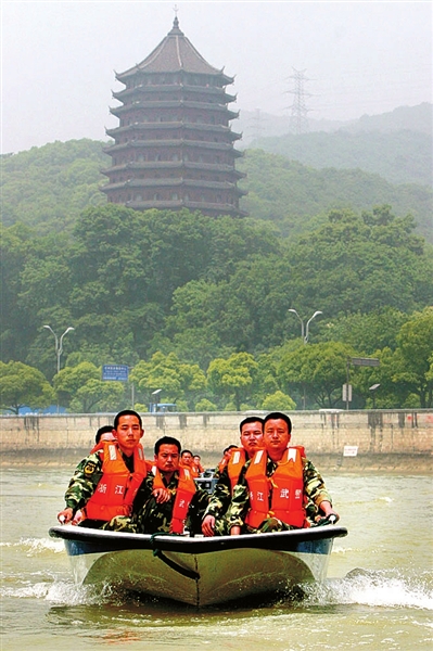 每当潮水袭来,武警杭州支队船艇大队的官兵就要驾艇去江中避潮。这是一个惊险又刺激的工作。“一天避潮2次,365天,天天如此。”在钱塘江上工作了24年的机电班班长左中文说。8月3日下午,潮水到来时,我们来到钱塘江边,体验避潮。