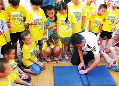 暑假里,温州公安局龙湾分局举办“民警子女暑期素质训练营”。80余名6至14岁的民警子女除了上阅读、英语等文化课,还参加游泳训练、采摘瓜果、野外求生等社会实践。图为小营员们正在体验海军叔叔的军营生活。
