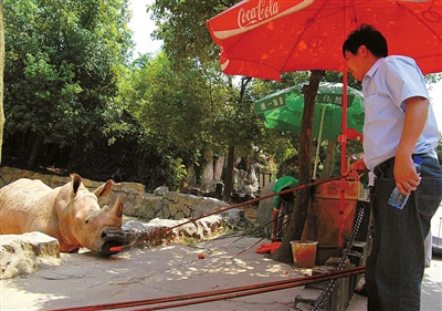 喂白犀牛?用长竹竿吧
